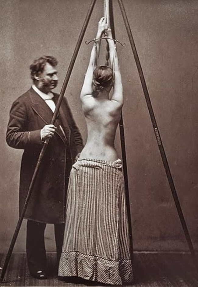 Lorsque la médecine était encore à l’état d’expérimentation, de nombreuses méthodes pour traiter les infections, les maladies mentales ou le bégaiement étaient utilisées qui se sont révélées sans résultat, cruelles ou même dangereuses. Des saignées, en passant par les chocs électriques, rien ne nous a été épargné. Même des médecins très sérieux ont mis au point des techniques douteuses, tel cet appareil imaginé par Lewis Sayre (un orthopédiste renommé de New-York) pour pendre les patients atteints de problèmes de dos.