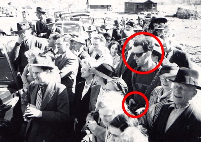 Cette photo a été prise lors de l’ouverture du Gold Bridge au Canada en 1941. Dans la foule, un homme se détache tant par son style que par ses accessoires. En effet, ses vêtements ne sont clairement pas communs au style des années 40 puisqu’il porte une veste à capuche, un T-shirt floqué et un appareil photo. Il porte aussi des lunettes noires.