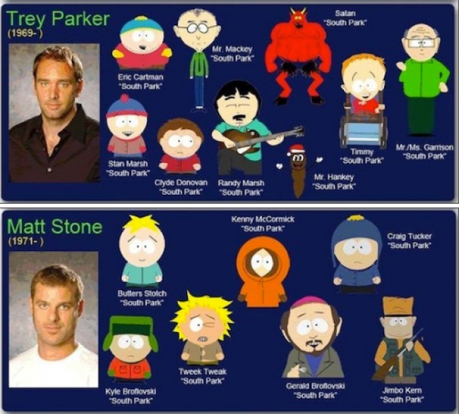 Dans la version originale, les créateurs de la série, Matt Stone and Trey Parker, s’occupent de toutes les voix de leurs nombreux personnages. Ils sont donc extrêmement actifs dans la série et pourtant on ne les voit jamais. Dans la version française, 4 personnes se partagent le travail.