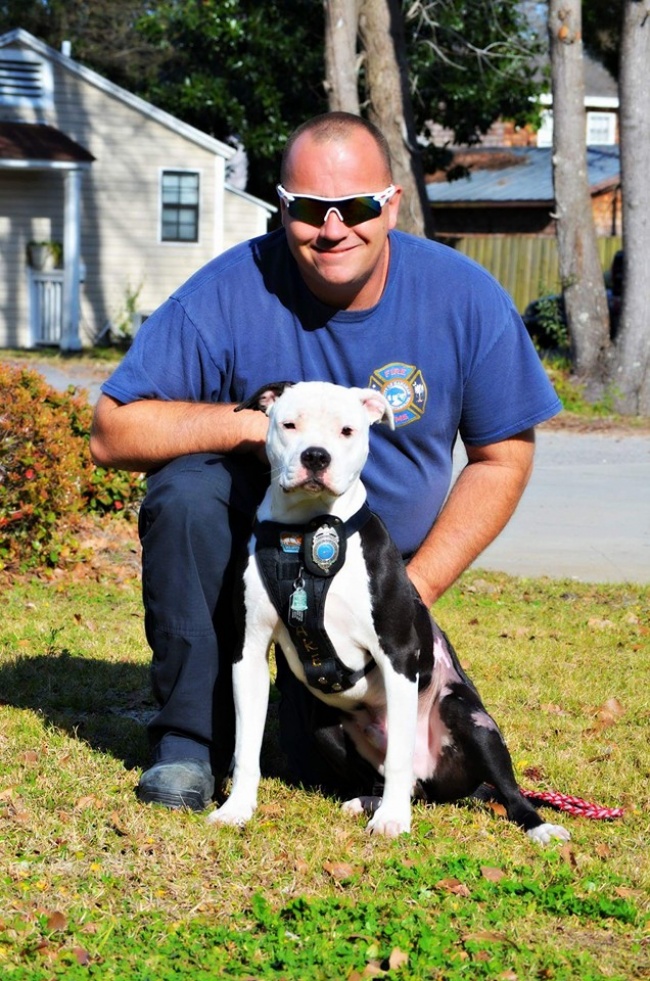 Lorsque Jake n’était encore qu’un chiot, il a été pris au piège par un feu, dans la grange dans laquelle il vivait. 75 % de son corps a été brûlé. Il a reçu tous les soins nécessaires et a été remis sur pieds, mais ses propriétaires n’ont pas souhaité le récupérer. Le pompier qui lui a sauvé la vie a été mis au courant et a adopté Jake. Depuis, il est devenu pompier, comme son maître !