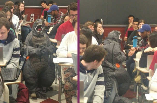 13. Aux États-Unis, cette maman professeur était devant un dilemme : laisser son fils de 7 ans seul à la maison, car il était malade, ou rater un jour de travail. Elle a décidé de l’amener avec elle en cours, dans un costume de Godzilla pour éviter qu’il ne s’ennuie !