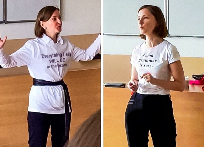« Tout ce que je dis sera nécessaire pour l’examen » (à gauche) « La bonne grammaire est sexy » (à droite)