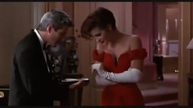 Tout le monde sait que cette scène relève de l’improvisation. Mais personne ne se lasse de l'entendre, car elle est tellement naturelle qu’elle donne encore plus d’intensité à l’amour des deux tourtereaux. Pour ceux qui l’ignorent encore, Richard Gere ne devait pas claquer la boîte sur la main de Julia Roberts. Et son éclat de rire est devenu l’un des plus beaux moments du film.