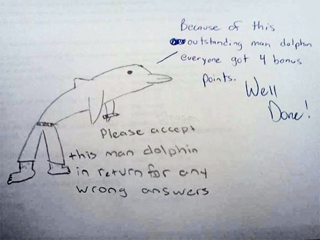 (Merci d’accepter cet homme dauphin en échange de mauvaises réponses. – Grâce à cet exceptionnel homme dauphin, j’attribue 4 points bonus à tout le monde. Bien joué !)