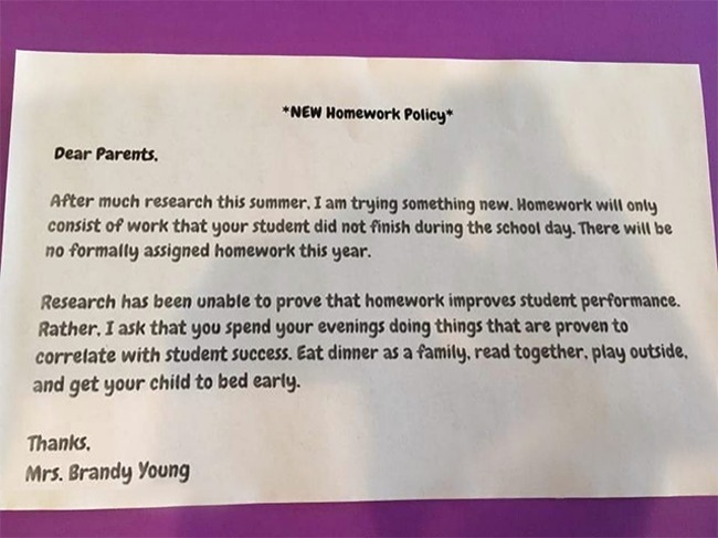 Après de longues recherches cet été, j’ai décidé de tester quelque chose de nouveau. Les devoirs seront désormais uniquement les travaux que vos enfants n’auront pas eu le temps de finir en classe. Il n’y aura aucun autre devoir à effectuer cette année.