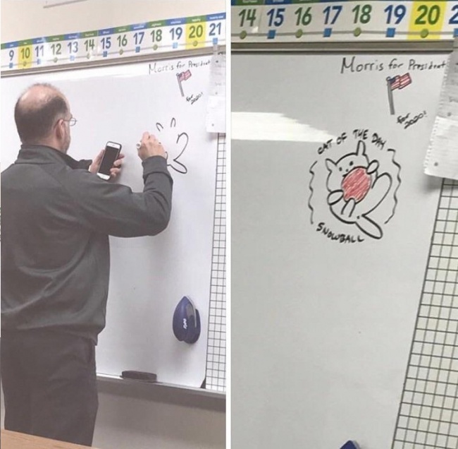 1. Notre professeur demande à un élève de dessiner un « chat du jour » sur le tableau. Aujourd’hui, celui qui devait dessiner était absent. Donc, il a sorti son téléphone et s’est connecté au web pour dessiner « chat de substitution ». J'adore ce professeur.