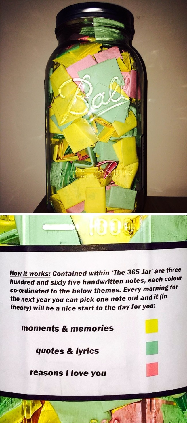 « Voici comment ça marche : dans ce bocal se trouvent 365 notes écrites à la main. Chaque couleur correspond à l'un des thèmes ci-dessous. Chaque matin de l’année à venir, tu peux choisir une note qui (en théorie) te fera bien commencer la journée. Moments et souvenirs : jaune. Citations et paroles de chansons : vert. Raisons pour lesquelles je t’aime : rose. »