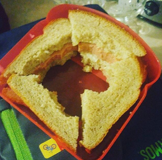 16. Beaucoup de personnes ne mangent pas la croûte sur le pain de mie, mais il reste encore de quoi manger sur ce sandwich !