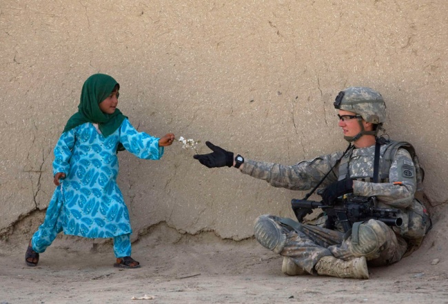 17. Cette jeune Afghane donne un bouquet de fleurs à un soldat américain, alors que celui-ci a patrouillé toute la nuit dans la vallée de l'Arghandab