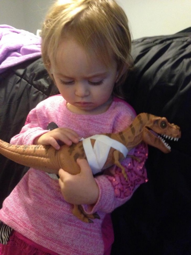 15. Cette petite fille de 2 ans a décidé de soigner les bobos de son dinosaure et lui fait des câlins pour qu’il aille mieux