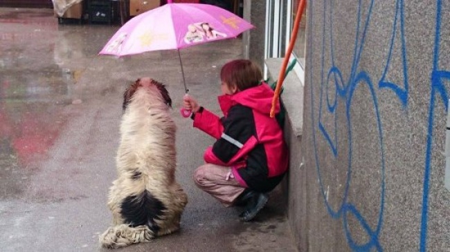 9. Cette petite fille partage son parapluie avec un chien errant pour le protéger de la pluie