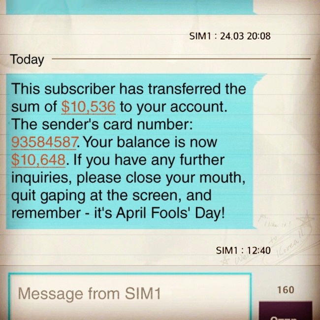 L’abonné a transféré la somme de 9371 € sur votre compte. Le numéro de carte de l’abonné est le 93584587. Votre montant s’élève actuellement à 9470 €. Pour toute question, merci de fermer ta bouche, d’éteindre ton téléphone et de te souvenir que c’est le premier avril !