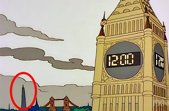 Dans l’épisode 19 de la saison 6 en 1995, Lisa se rend à Londres. En arrière-plan, vous pouvez voir apparaître une espèce de grande tour à gauche du Tower Bridge. Cette tour ressemble à s’y méprendre à « The Shard ». Sauf que la construction n’a commencé que 14 ans plus tard.