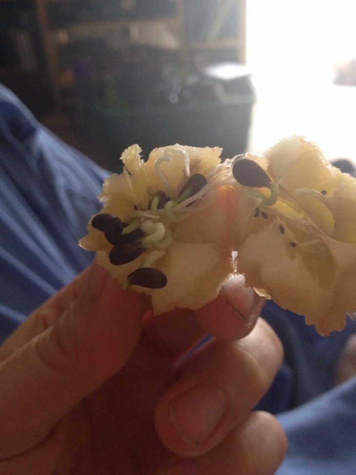 6. Cette pomme, tout comme la tomate plus haut, a ses pépins qui ont commencé à germer !