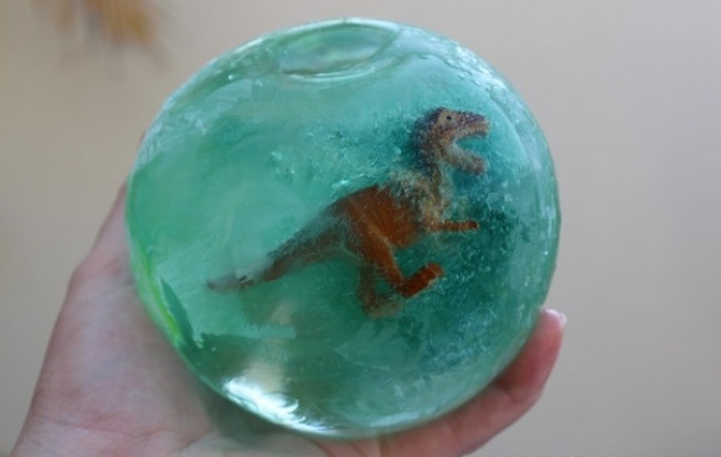 - Plaçez la figurine dans le ballon et remplissez-le d'eau. Vous pouvez ajouter du colorant alimentaire si vous le souhaitez. Fermez le ballon à l’aide d’un nœud et placez-le au congélateur pendant quelques heures. Lorsque l'eau se transformera en glace, coupez le ballon et donnez la forme obtenue à votre enfant pour qu'il commence à creuser. Il fera une découverte sensationnelle. Protégez ses yeux avec des lunettes de sécurité : on est jamais trop prudent !