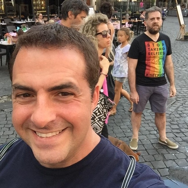 Le T-shirt du monsieur à l’arrière-plan indique « arrêtez de prendre des selfies ».