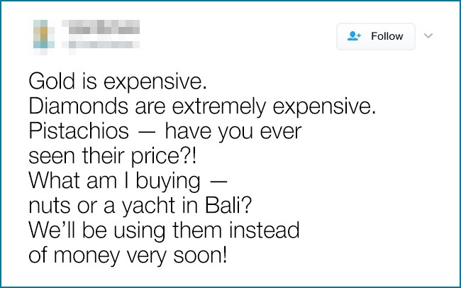 Les pistaches – avez-vous déjà vu leur prix ? Qu’est-ce que j’achète au juste ? Des pistaches ou un yacht à Bali ? Dans pas longtemps, elles remplaceront la monnaie ! »