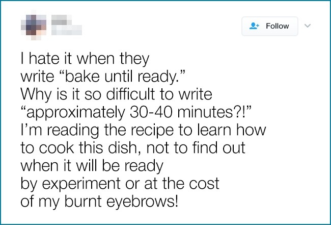 « Je déteste lorsqu’ils disent « cuire jusqu’à ce que ce soit prêt » Est-ce qu’il est trop compliqué de dire cuire environ 30-40 minutes ?! Je lis la recette pour apprendre à cuisiner ce plat, pas pour apprendre qu’il est cuit quand il est cuit, en mettant en péril mes sourcils pour vérifier toutes les 5 minutes si le plat est prêt ! »