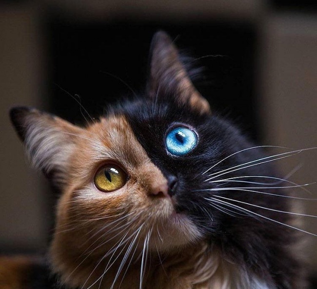 En plus d’avoir le visage « coupé » en deux, il a les yeux vairons !