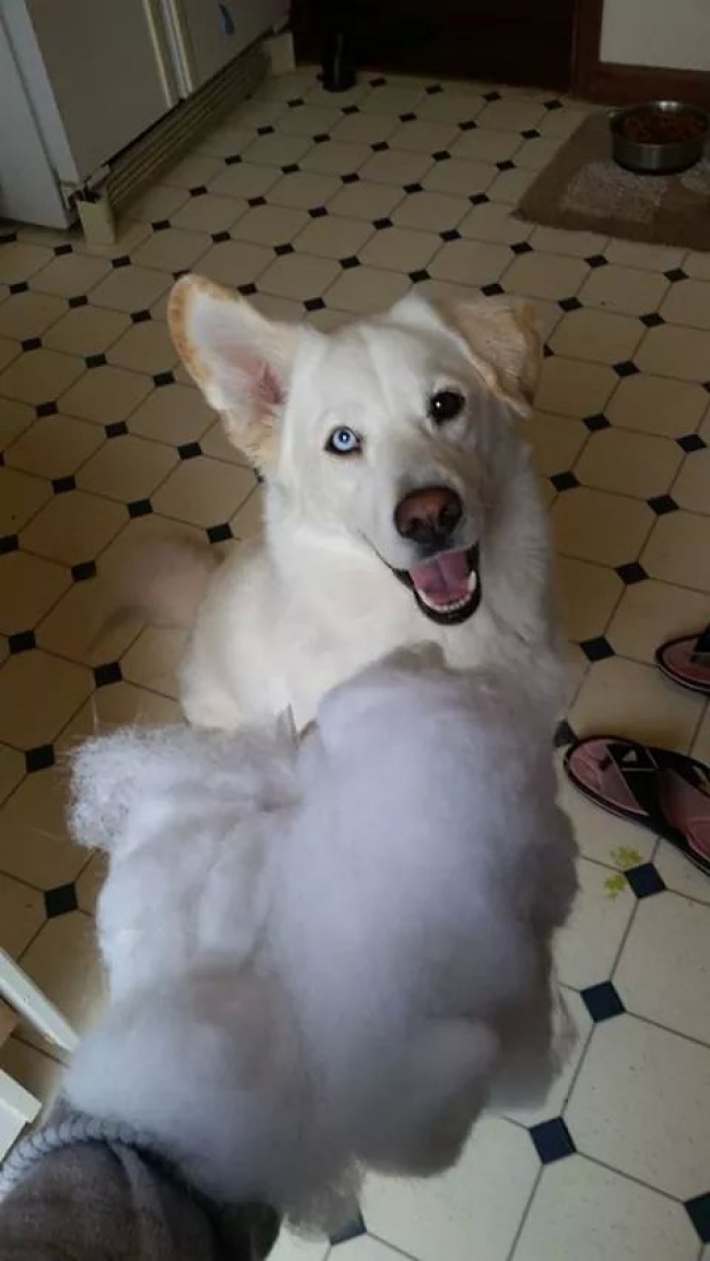 Si vous cachez un côté de son visage, vous retrouvez le Husky et en cachant l’autre, vous retrouvez le Labrador !