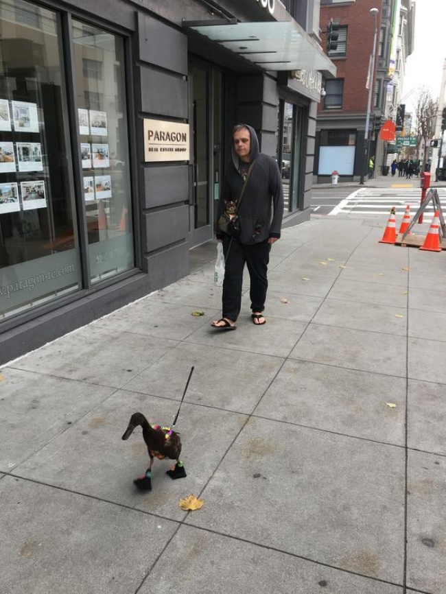17. Cet homme promène son canard en laisse et porte son chien dans sa poche… Tout va bien !