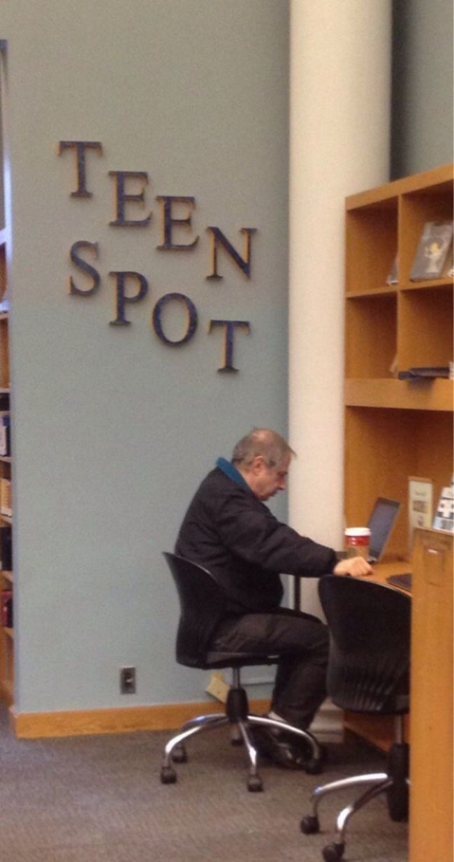 Au-dessus de l’endroit où cet homme d’un certain âge est assis, on peut lire en grosses lettres : « Coin ados ». Peut-être que le monsieur est là depuis très longtemps...