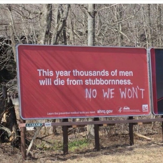 « Cette année des milliers d’hommes mourront à cause de leur entêtement » et quelqu’un a peint en-dessous « Non on ne mourra pas ». Il s’agit d’une affiche gouvernementale destinée à encourager les hommes à se rendre chez le médecin pour des tests de prévention car ils sont souvent bornés et refusent les dépistages jusqu’à ce qu’il soit trop tard.