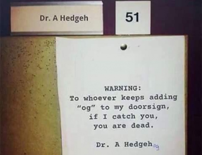 Sous la sonnette de l’appartement numéro 51 du Dr. Héris on trouve une note excédée : « Avertissement : à celui qui n’arrête pas d’ajouter « son » à mon étiquette, si je t’attrape, t’es mort. Dr. Héris » et le coupable récidiviste a ajouté à la signature de la note « son ». Hedgehog = hérisson.