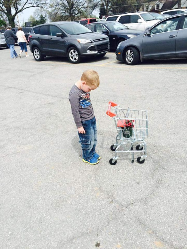 22. Vous pensez avoir trouvé l’astuce suprême pour qu’il vous suive en paix ? Non ! Sachez qu’il ne comprendra pas qu’il faille laisser le chariot au magasin !