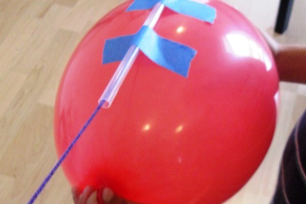 Attachez la corde à l’arrière d’une chaise, enfilez une paille à l’autre extrémité de la corde. Attachez l’extrémité de la corde à l’arrière de la deuxième chaise. Gonflez ensuite le ballon sans nouer le bout, pincez-le simplement avec vos doigts, et scotchez la paille avec du ruban adhésif sur le ballon. Vous n’avez plus qu’à lâcher votre fusée !