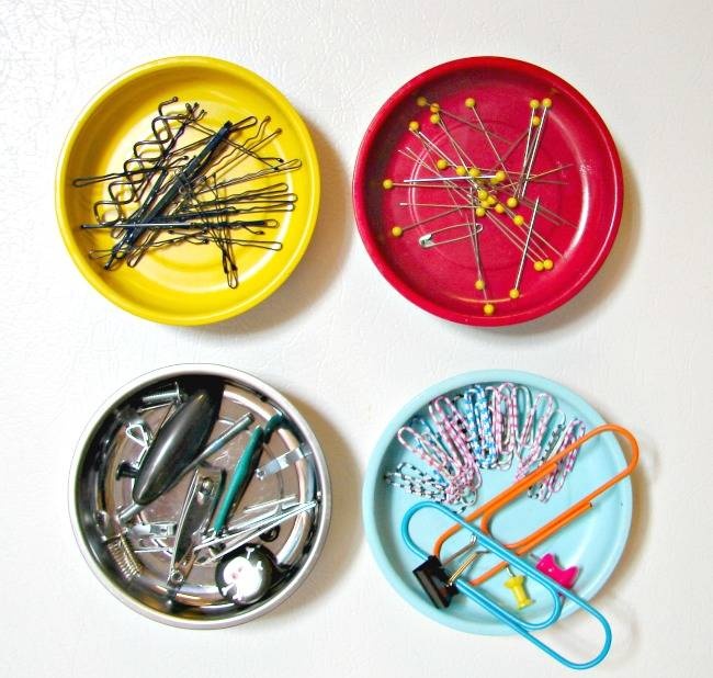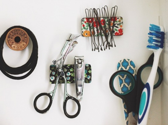 Ces petites boîtes métalliques que vous trouverez pour stocker des vis ou des clous s’utilisent parfaitement pour des épingles à nourrice. Pour éviter de vous éparpiller, collez ces boîtes contre votre mur !