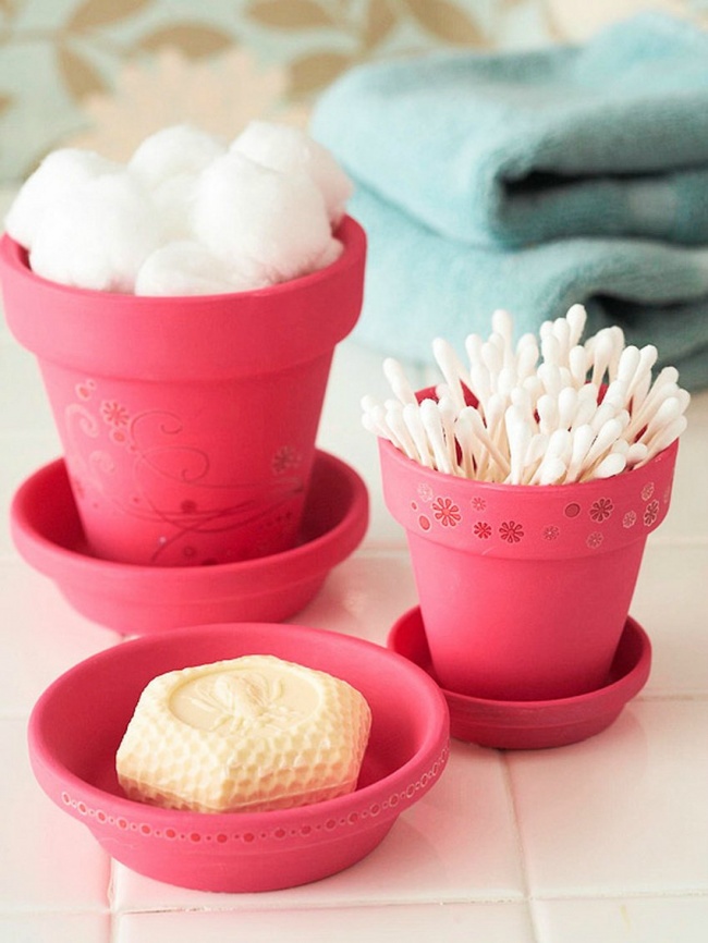Des pots de fleurs colorés peuvent faire office de super porte-savon et ajouter une déco tendance à votre salle de bain.