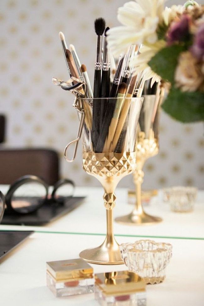 Vous pouvez également utiliser de jolies coupes, verres ou pots pour y déposer vos plus précieux pinceaux. En plus, cela donnera une touche très chic à votre salle de bains.