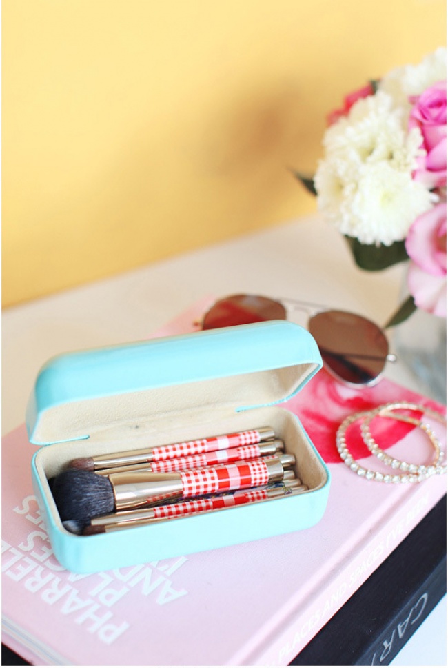 Si vous avez des étuis à lunettes dont vous ne vous servez pas, utilisez-les pour y ranger tous vos jeux de pinceaux à maquillages. Ça vous évite de les éparpiller, et c’est très pratique à transporter !