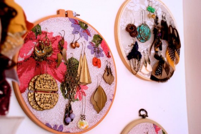 Récupérez un cadran pour réaliser du point de croix pour y accrocher vos boucles d’oreilles, ou confectionnez-le vous-même en utilisant un morceau de tissu fixé sur un cadre en bois. Et voilà, le tour est joué !
