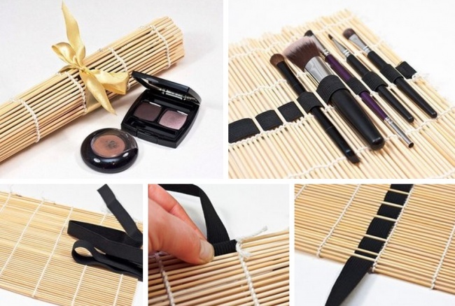 Si vous voulez confectionner votre rangement vous-même, prenez un dessous de table en bambou et faites passer un élastique plat en tissu entre les branches. Vous n’avez plus qu’à insérer vos pinceaux entre l’élastique et le dessous de table, pour qu’ils ne s’échappent plus et que vous puissiez les transporter sereinement en enroulant la serviette sur elle-même.