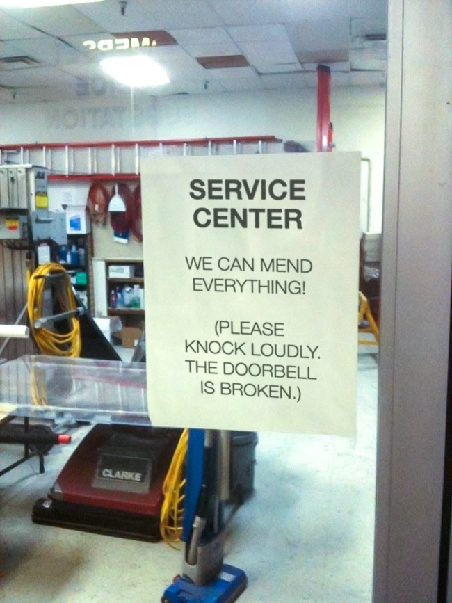 « Service d’entretien. On peut tout réparer (Nous vous prions de frapper fort car la sonnette est cassée) »