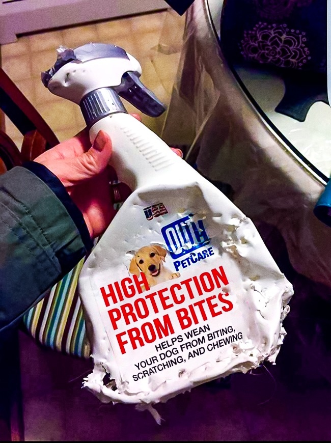 Il s’agit d’un vaporisateur destiné aux chiens. L’étiquette affirme « Haute protection contre les morsures. Aide votre chien à ne plus de mordre, gratter, et mâchouiller ». On voit ça !