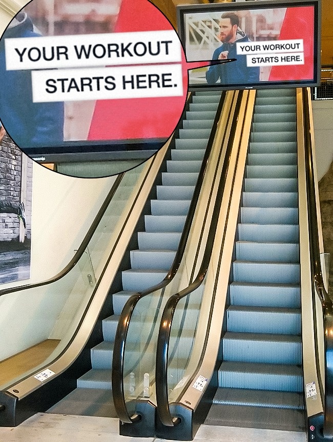 Inutile de visiter ce magasin si vous n’êtes pas sérieux. Après la porte d’entrée les clients sont directement accueillis par un escalier mécanique en panne assorti du message « Votre entraînement commence ici ».