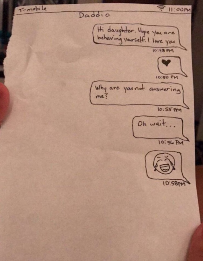 « Coucou ma fille, j’espère que tu t’es bien comportée. Je t’aime » - « <3 » - « Pourquoi tu ne me réponds pas ? » - « Oh attends… » « Looool »