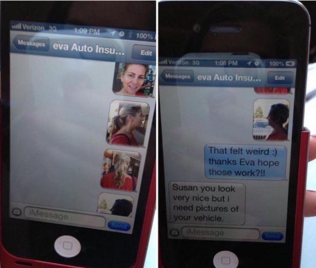« C’est étrange... Merci Eva, j’espère que ça vous conviendra ?!! » - « Susan, vous êtes très jolie, mais ce sont les photos de votre véhicule dont j’ai besoin… »