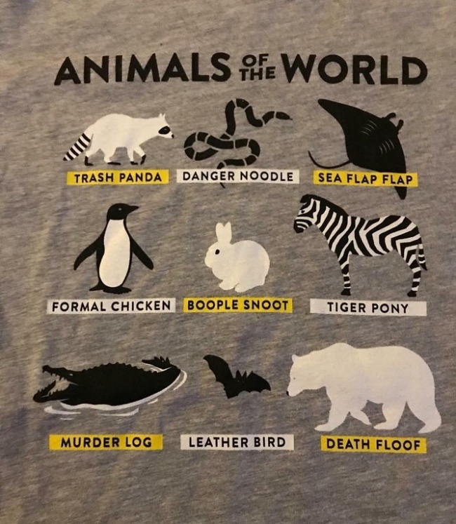 « Un panda poubelle – Une nouille dangereuse – Le rabat de la mer – Un poulet sur son 31 – Boule de poils avec un nez – Poney tigré – Une buche meurtrière – un oiseau en cuir – La douce mort »