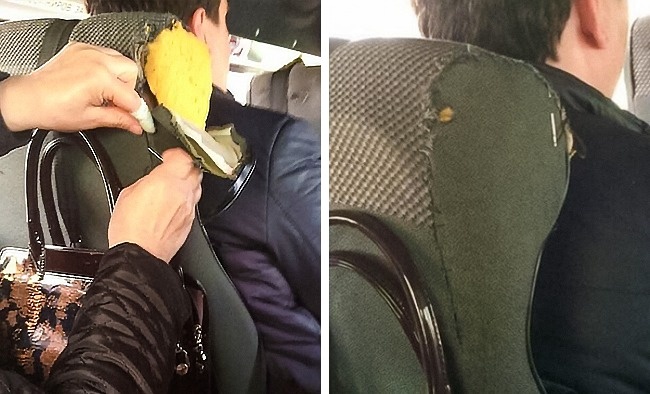 Durant son trajet, cette femme a raccommodé un siège déchiré dans un bus de ville…