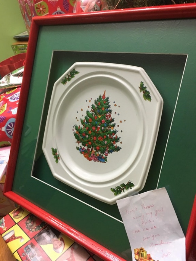 Cette grand-mère a utilisé les mêmes assiettes en plastique depuis les 30 derniers Noëls. Mais cette année, il n’en restait que 7. Alors elle les a encadrées et en a donné une à chacun de ses 7 petits enfants !