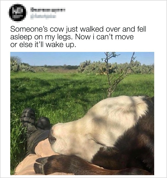 « Cette vache est venue vers moi et s’est endormie sur mes jambes. Maintenant je ne peux plus bouger tant qu’elle ne se réveille pas »