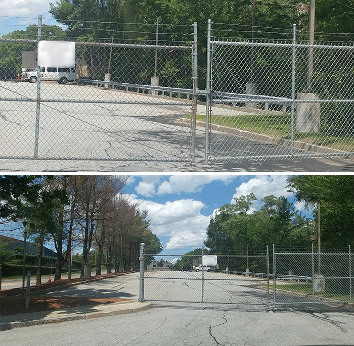 13. Cherchez l’erreur… Il y a du barbelé partout au-dessus du portail, mais… Il n’y a qu’un portail et pas de barrière…