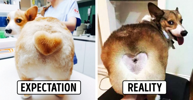 29. Cette propriétaire de Corgi l’a amené chez le toiletteur en demandant que la queue soit comme sur la photo de gauche (en forme de cœur). Elle a récupéré son chien avec une toute autre sorte de cœur… (photo de droite)