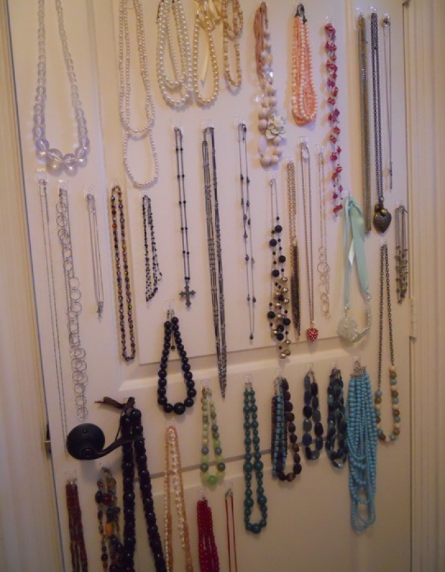 19. Utilisez une porte pour fixer des crochets adhésifs et suspendre vos colliers. Ainsi, dites adieu à vos bijoux emmêlés