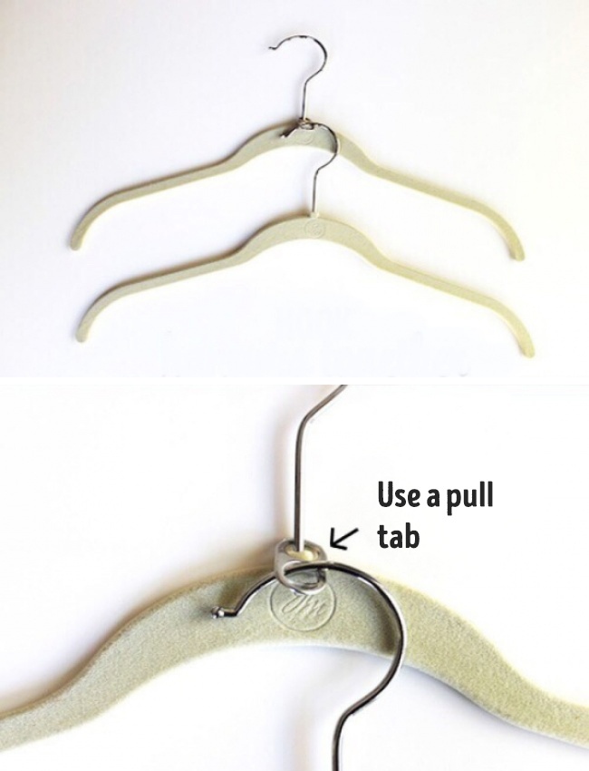 24. Accrochez vos cintres les uns aux autres à l’aide de capsules de canettes et gagnez deux fois plus de place dans vos placards