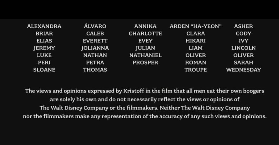 23. Disney précise dans son générique et crédits que l’opinion du personnage de Kristoff dans La Reine des Neiges, stipulant que tous les hommes mangent leurs crottes de nez, n’est que son point de vue personnel et non celui de l’entreprise Disney.